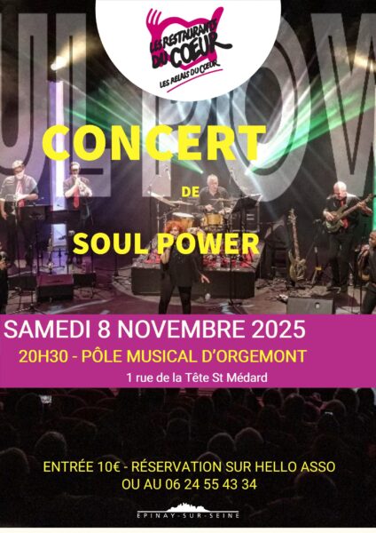 Dans le cadre des actions culturelles des Restos du CĆur, le centre de distribution d’Ăpinay vous invite Ă une soirĂ©e exceptionnelle placĂ©e sous le signe de la musique et de la gĂ©nĂ©rositĂ©. Le groupe SOUL POWER se produira en concert le 8 novembre 2025 Ă 20h30, avec un objectif clair : soutenir les plus dĂ©munis.